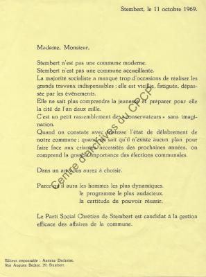Imprimé électoral de la liste PSC de Stembert réalisé à l'occasion des élections communales du 11 octobre 1970.