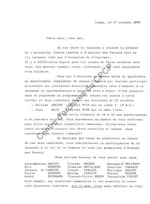 Imprimé électoral des Jeunes PSC de Liège réalisé à l'occasion des élections communales du 11 octobre 1970.