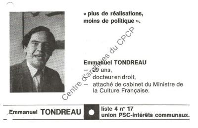 Imprimé électoral du candidat PSC de Mons Emmanuel Tondreau réalisé à l'occasion des élections communales du 11 octobre 1970.