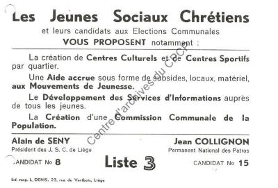 Imprimé électoral des Jeunes PSC de Liège réalisé à l'occasion des élections communales du 11 octobre 1970.