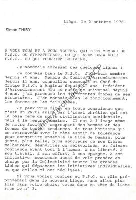 Imprimé électoral du candidat PSC Liégeois Simon Thiry réalisé à l'occasion des élections communales du 10 octobre 1976.
