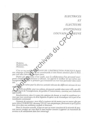 Imprimé électoral du candidat de la liste Intérêts Communaux (tendance PSC) d'Ottignies-Louvain-la-Neuve Roger Delain réalisé à l'occasion des élections communales du 10 octobre 1982.