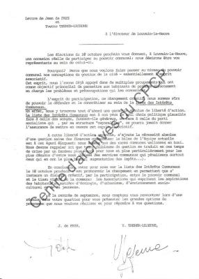 Imprimé électoral des candidats de la liste Intérêts Communaux (tendance PSC) d'Ottignies-Louvain-la-Neuve Jean de Fays et Yvette Therer-Lejeune réalisé à l'occasion des élections communales du 10 octobre 1982.