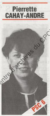 Imprimé électoral de la candidate PSC Pierrette Cahay-André réalisé dans le cadre des élections européennes du 17 juin 1984.