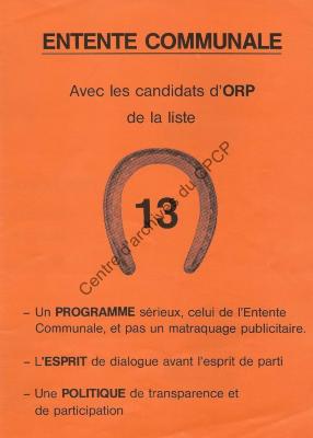 Imprimé électoral de la liste Entente Communale (tendance PSC) d'Orp-Jauche réalisé à l'occasion des élections communales du 9 octobre 1988.