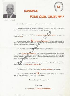 Imprimé électoral du candidat PSC Jacques de Locht réalisé à l'occasion des élections communales du 9 octobre 1988.