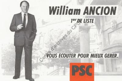 Imprimé électoral du conseiller communal PSC de Liège William Ancion réalisé à l'occasion des élections communales du 9 octobre 1988.