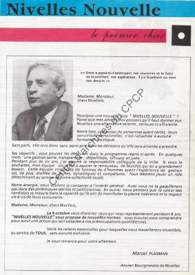 Imprimé électoral de Marcel Plasman, tête de liste de la liste Nivelles Nouvelle (tendance PSC), réalisé à l'occasion des élections communales du 9 octobre 1988