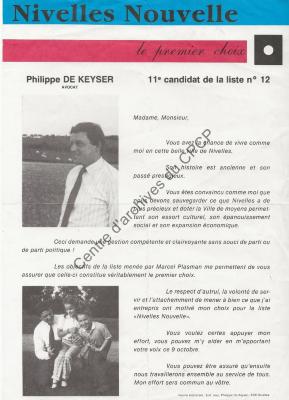 Imprimé électoral de Philippe De Keyser, candidat de la liste Nivelles Nouvelle (tendance PSC), réalisé à l'occasion des élections communales du 9 octobre 1988.