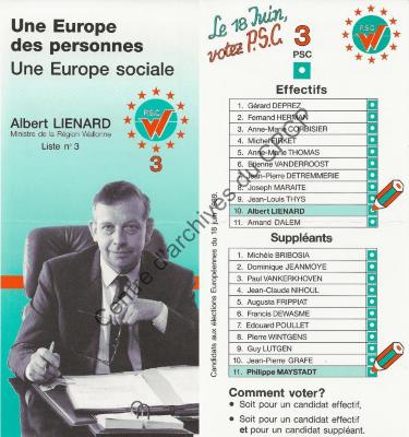 Imprimé électoral du Ministre PSC Albert Liénard réalisé à l'occasion des élections européennes du 18 juin 1989.