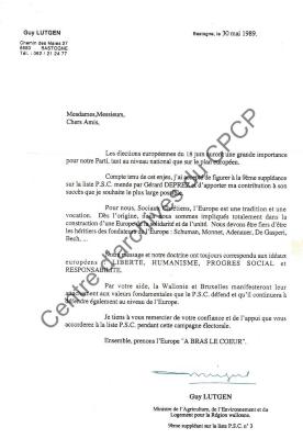 Imprimé électoral du Ministre PSC Guy Lutgen réalisé à l'occasion des élections européennes du 18 juin 1989.