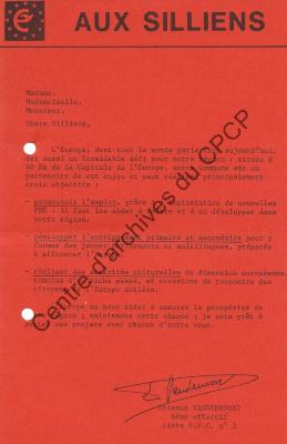 Imprimé électoral du candidat PSC Etienne Vanderroost réalisé à l'occasion des élections européennes du 18 juin 1989.
