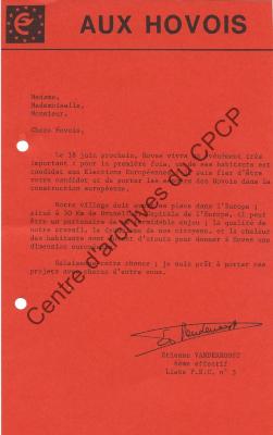 Imprimé électoral du candidat PSC Etienne Vanderroost réalisé à l'occasion des élections européennes du 18 juin 1989.