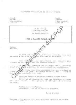 Imprimé électoral de soutien de l'Alliance Agricole Belge aux candidats PSC Joseph Delwart et André Senesael et réalisé à l'occasion des élections communales et provinciales du 9 octobre 1994.