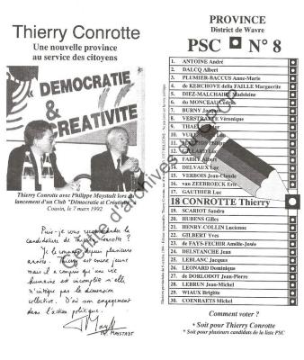 Imprimé électoral du candidat PSC Thierry Conrotte réalisé à l'occasion des élections communales et provinciales du 9 octobre 1994.