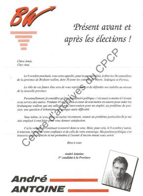 Imprimé électoral du député PSC André Antoine réalisé à l'occasion des élections communales et provinciales du 9 octobre 1994.