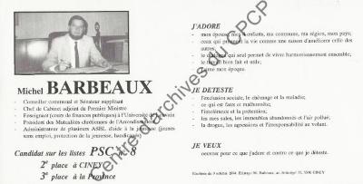 Imprimé électoral du candidat PSC Michel Barbeaux réalisé à l'occasion des élections communales et provinciales du 9 octobre 1994.