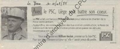 Imprimé électoral de l'échevin PSC de Liège William Ancion réalisé à l'occasion des élections communales et provinciales du 9 octobre 1994.