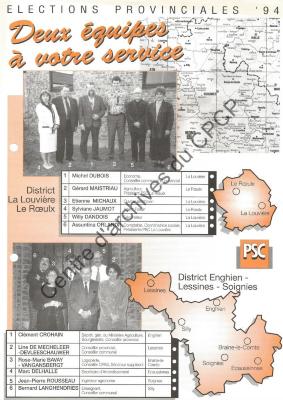 Imprimé électoral de candidats PSC de la province du Hainaut réalisé à l'occasion des élections communales et provinciales du 9 octobre 1994.