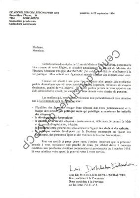 Imprimé électoral de la candidate PSC Line De Mecheleer-Devleeschauwer réalisé à l'occasion des élections communales et provinciales du 9 octobre 1994.