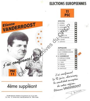Imprimé électoral du candidat PSC Etienne Vanderroost réalisé à l'occasion des élections européennes du 12 juin 1994.