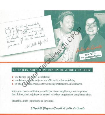 Imprimé électoral de soutien d'Elisabeth Dispaux-Cornil à la candidate PSC Julie de Groote réalisé à l'occasion des élections européennes du 12 juin 1994.