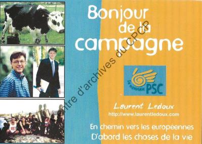 Imprimé électoral du candidat du nouveau PSC Laurent Ledoux réalisé à l'occasion des élections européennes du 13 juin 1999.