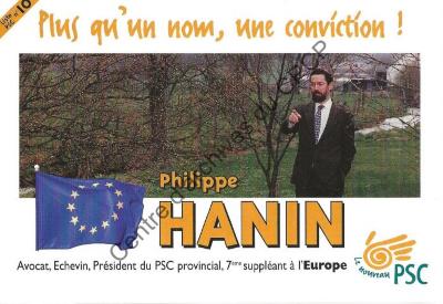Imprimé électoral du candidat du nouveau PSC Philippe Hanin réalisé à l'occasion des élections européennes du 13 juin 1999.