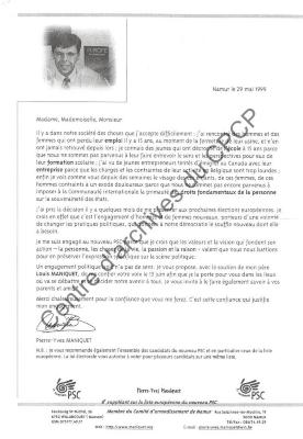 Imprimé électoral du candidat du nouveau PSC Pierre-Yves Maniquet réalisé à l'occasion des élections européennes du 13 juin 1999.