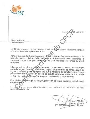 Imprimé électoral du candidat du nouveau PSC Dominique Harmel réalisé à l'occasion des élections européennes du 13 juin 1999.