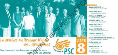 Imprimé électoral de la liste provinciale du Brabant wallon du nouveau PSC réalisé à l'occasion des élections communales et provinciales du 8 octobre 2000.