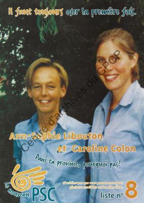 Imprimé électoral des candidates du nouveau PSC Anne-Sophie Libouton et Caroline Colon réalisé à l'occasion des élections communales et provinciales du 8 octobre 2000.
