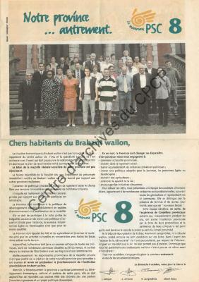 Imprimé électoral de la liste provinciale du Brabant wallon du nouveau PSC réalisé à l'occasion des élections communales et provinciales du 8 octobre 2000.