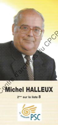 Imprimé électoral du candidat du nouveau PSC Michel Halleux réalisé à l'occasion des élections communales et provinciales du 8 octobre 2000.