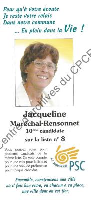 Imprimé électoral de la candidate du nouveau PSC Jacquelines Maréchal-Rensonnet réalisé à l'occasion des élections communales et provinciales du 8 octobre 2000.