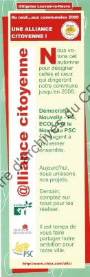 Imprimé électoral de la liste alliance citoyenne d'Ottignies-Louvain-la-Neuve réalisé à l'occasion des élections communales et provinciales du 8 octobre 2000.