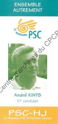 Imprimé électoral du candidat du nouveau PSC André Kints réalisé à l'occasion des élections communales et provinciales du 8 octobre 2000.