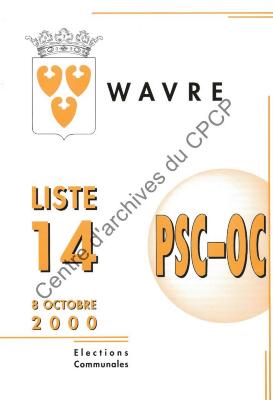 Imprimé électoral de liste du nouveau PSC pour la ville de Wavre réalisé à l'occasion des élections communales et provinciales du 8 octobre 2000.