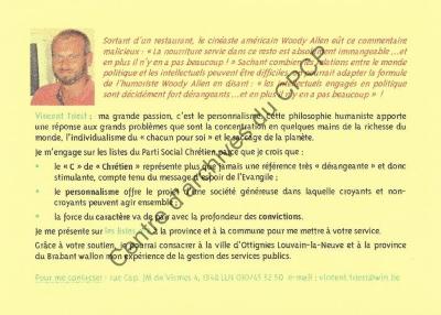 Imprimé électoral du candidat du nouveau PSC Vincent Triest réalisé à l'occasion des élections communales et provinciales du 8 octobre 2000.