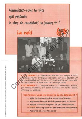 Imprimé électoral des Jeunes PSC de la commune de Namur réalisé à l'occasion des élections communales et provinciales du 8 octobre 2000.