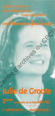 Imprimé électoral de la candidate du nouveau PSC Julie de Groote réalisé à l'occasion des élections communales et provinciales du 8 octobre 2000.