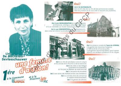 Imprimé électoral de la candidate du nouveau PSC Line De Mecheleer-De Vleeschauwer réalisé à l'occasion des élections communales et provinciales du 8 octobre 2000.