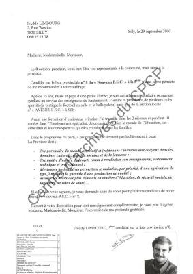Imprimé électoral du candidat du nouveau PSC Freddy Limbourg réalisé à l'occasion des élections communales et provinciales du 8 octobre 2000.