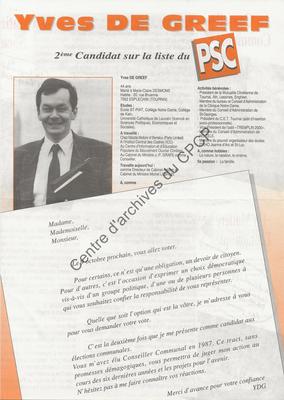 Imprimé électoral du candidat PSC tournaisien Yves De Greef réalisé à l'occasion des élections communales et provinciales du 9 octobre 1994.