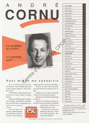 Imprimé électoral du candidat PSC tournaisien André Cornu réalisé à l'occasion des élections communales et provinciales du 9 octobre 1994.