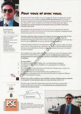 Imprimé électoral du candidat PSC tournaisien Jean Foncoux réalisé à l'occasion des élections communales et provinciales du 9 octobre 1994.