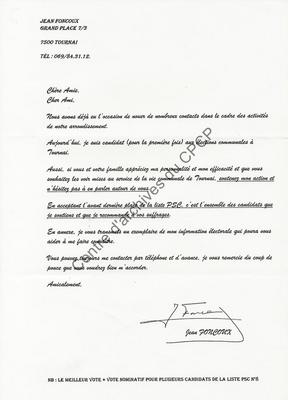 Imprimé électoral du candidat PSC tournaisien Jean Foncoux réalisé à l'occasion des élections communales et provinciales du 9 octobre 1994.