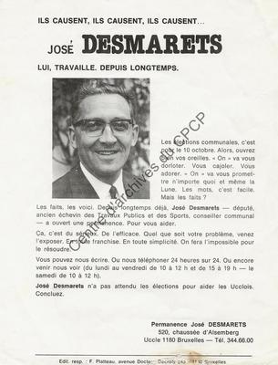 Imprimé électoral de l'échevin PSC de Uccle José Desmarets réalisé à l'occasion des élections communales du 10 octobre 1976.