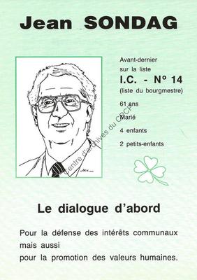 Imprimé électoral de l'ancien sénateur PSC Jean Sondag, membre de la liste Intérêts Communaux (tendance PSC) d'Ottignies-Louvain-la-Neuve, réalisé à l'occasion des élections communales du 9 octobre 1988.