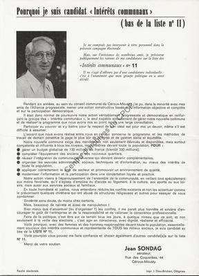Imprimé électoral du sénateur PSC Jean Sondag, membre de la liste Intérêts Communaux (tendance PSC) d'Ottignies-Louvain-la-Neuve, réalisé à l'occasion des élections communales du 10 octobre 1976.